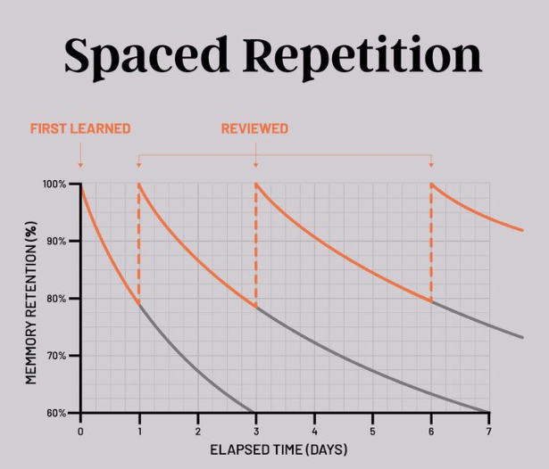 Si nous répétons une leçon quelques semaines plus tard, on multiplie par trois le nombre d’éléments qui seront retenus. L’idéal pour un cours sera de le relire le soir même ou le lendemain puis de le revoir dans 1 semaine, puis dans 3 semaines et ensuite dans quelques mois. La règle consistant à espacer les apprentissages.